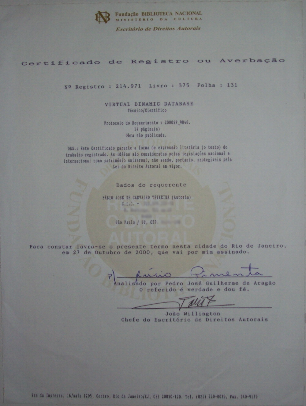 Após 2 anos de testes, buscas de anterioridade, e validação técnica, foi registrada na Biblioteca Nacional sob número 214.971, em 27 de outubro de 2000.